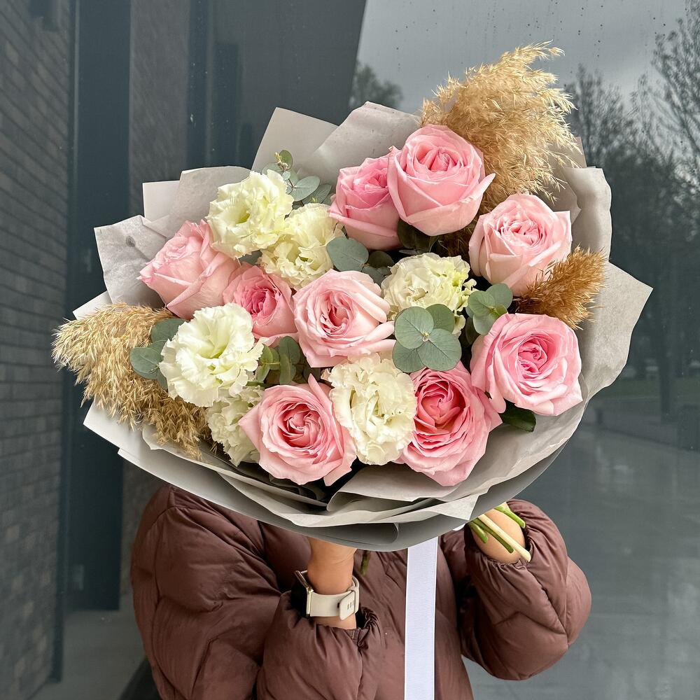 Эвкалипт – 1 шт. Эустома – 3 шт. пионовидная роза охара – 9 шт. пампас – 3 шт.