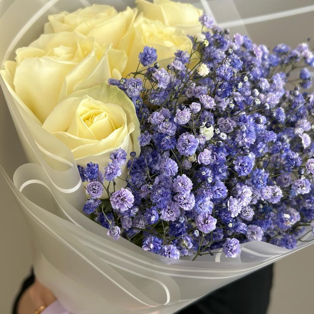 Букет из фиолетовых гипсофил и белых роз