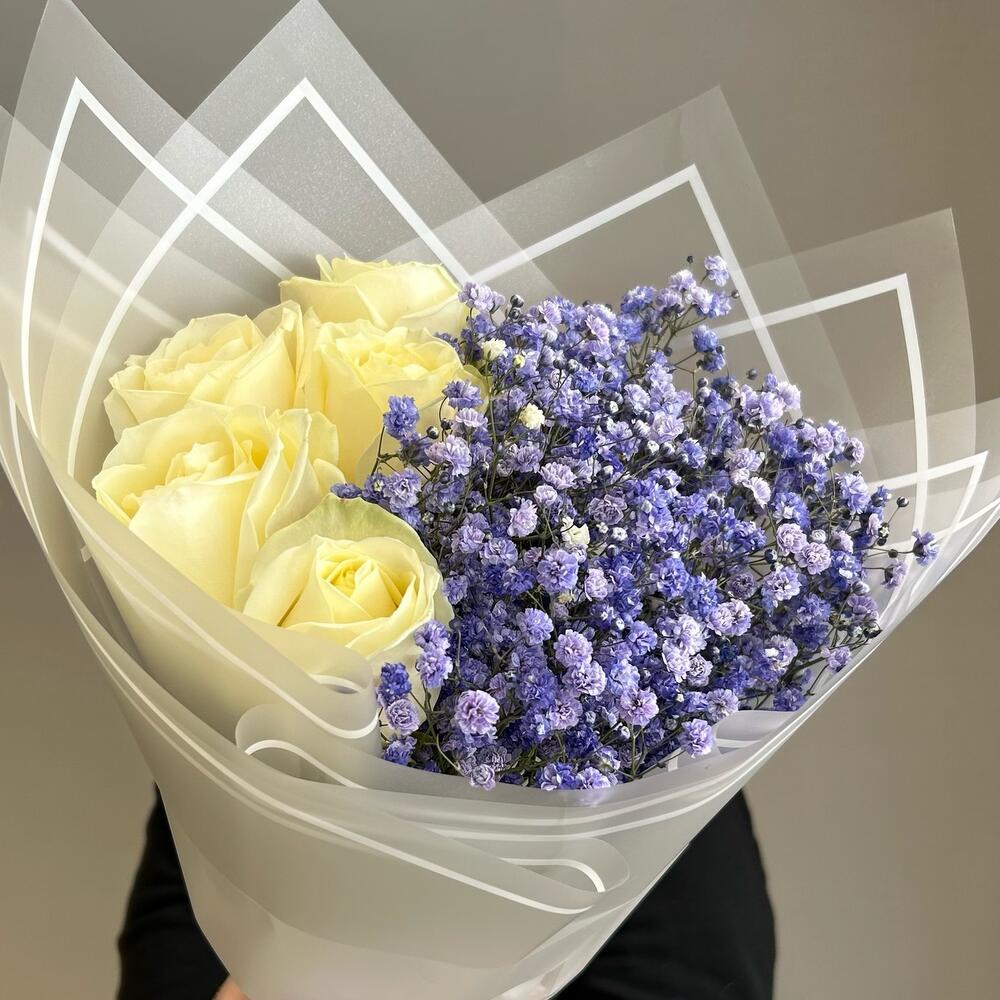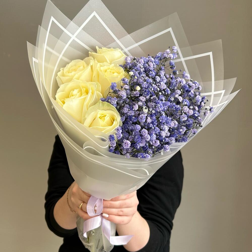 Гипсофила – 4 шт.Роза – 5 шт.Лента атласная – 1 шт.Упаковка дизайнерская – 2 шт.
