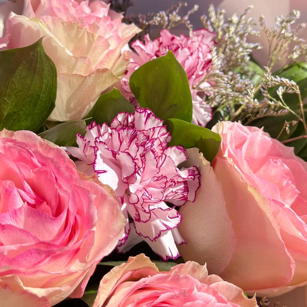 Роза – 5 шт.Диантус – 3 шт.лимониму – 3 шт.Рускус – 3 шт.Упаковка дизайнерская – 4 шт.лета – 2 шт.