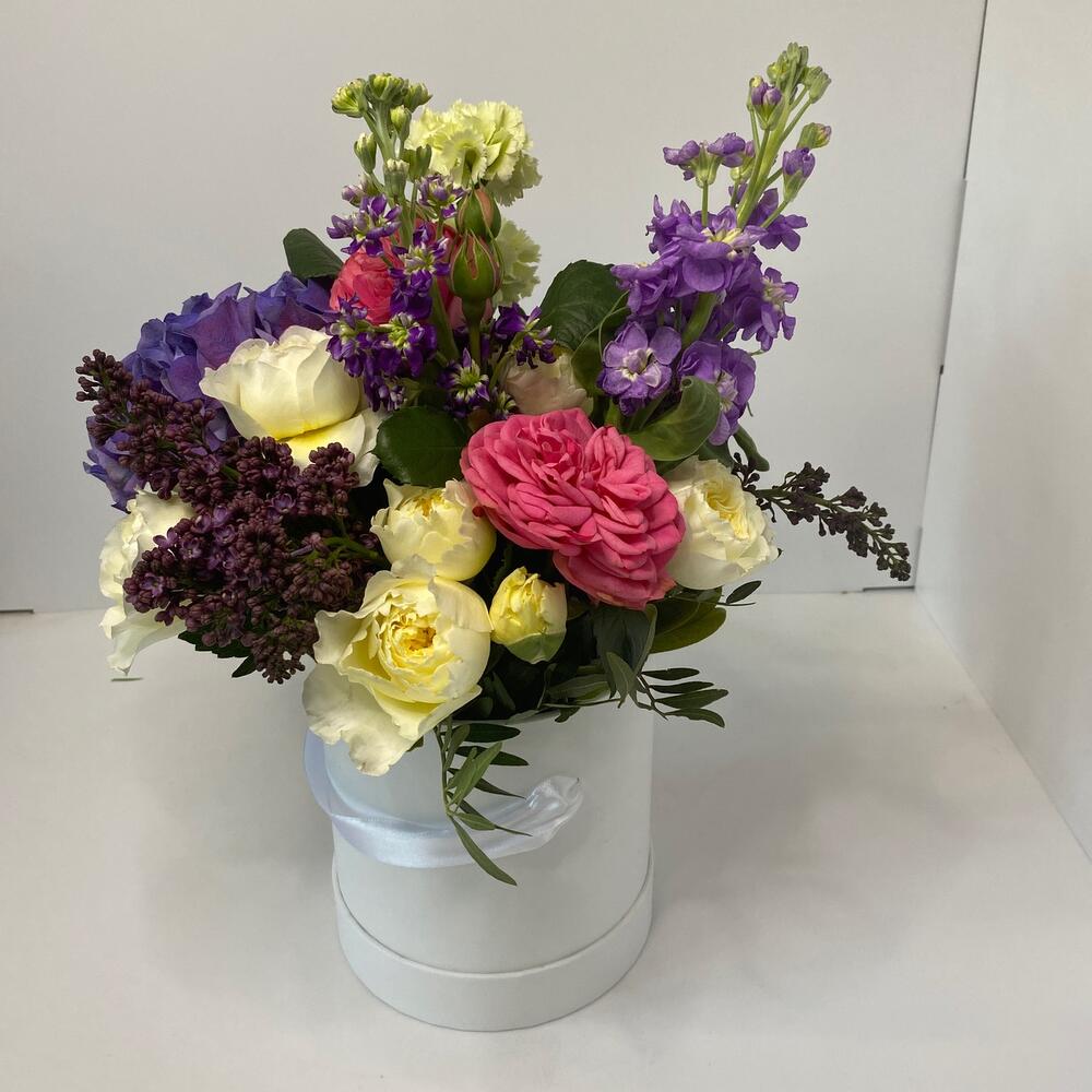 Гортензия и кустовая роза в шляпной коробке