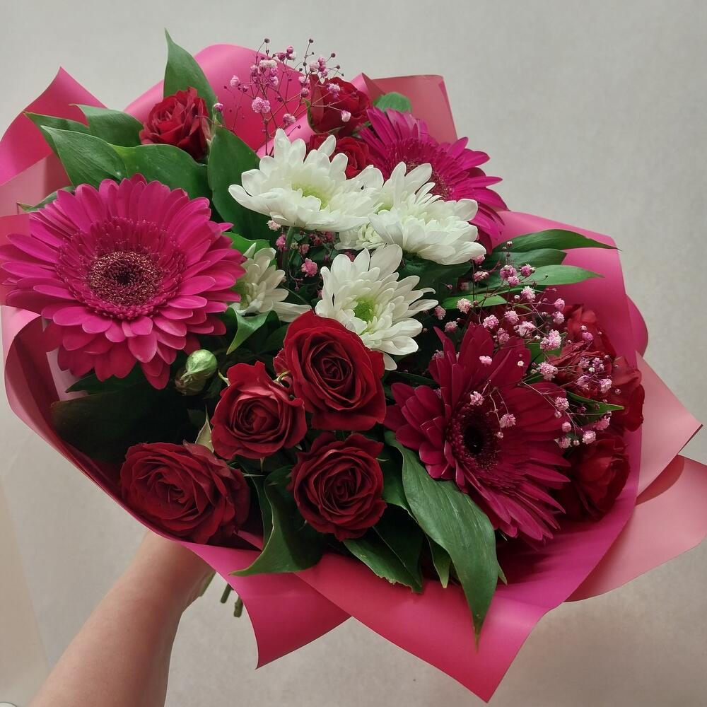 Категорий: Герберы, Гипсофила, Кустовые розы, Розы, Хризантемы