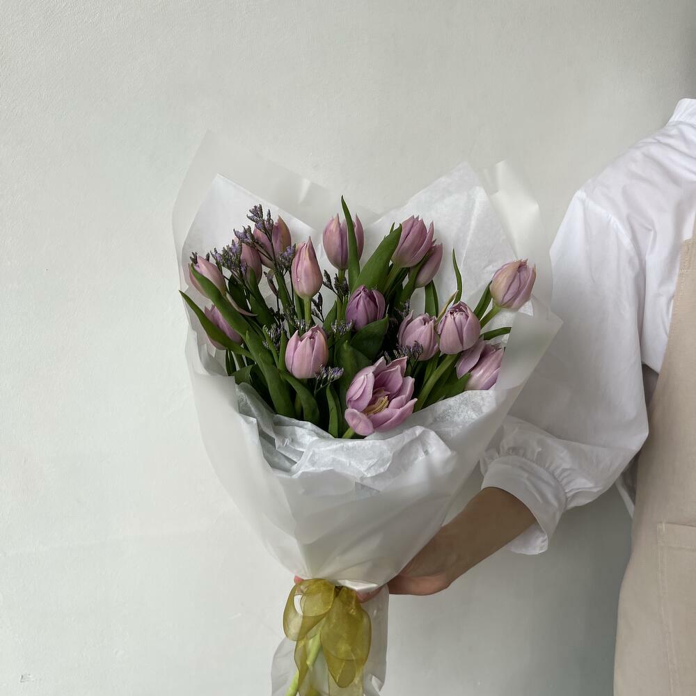 Лимониум – 1 шт.Тюльпан – 15 шт.Упаковка – 1 шт.